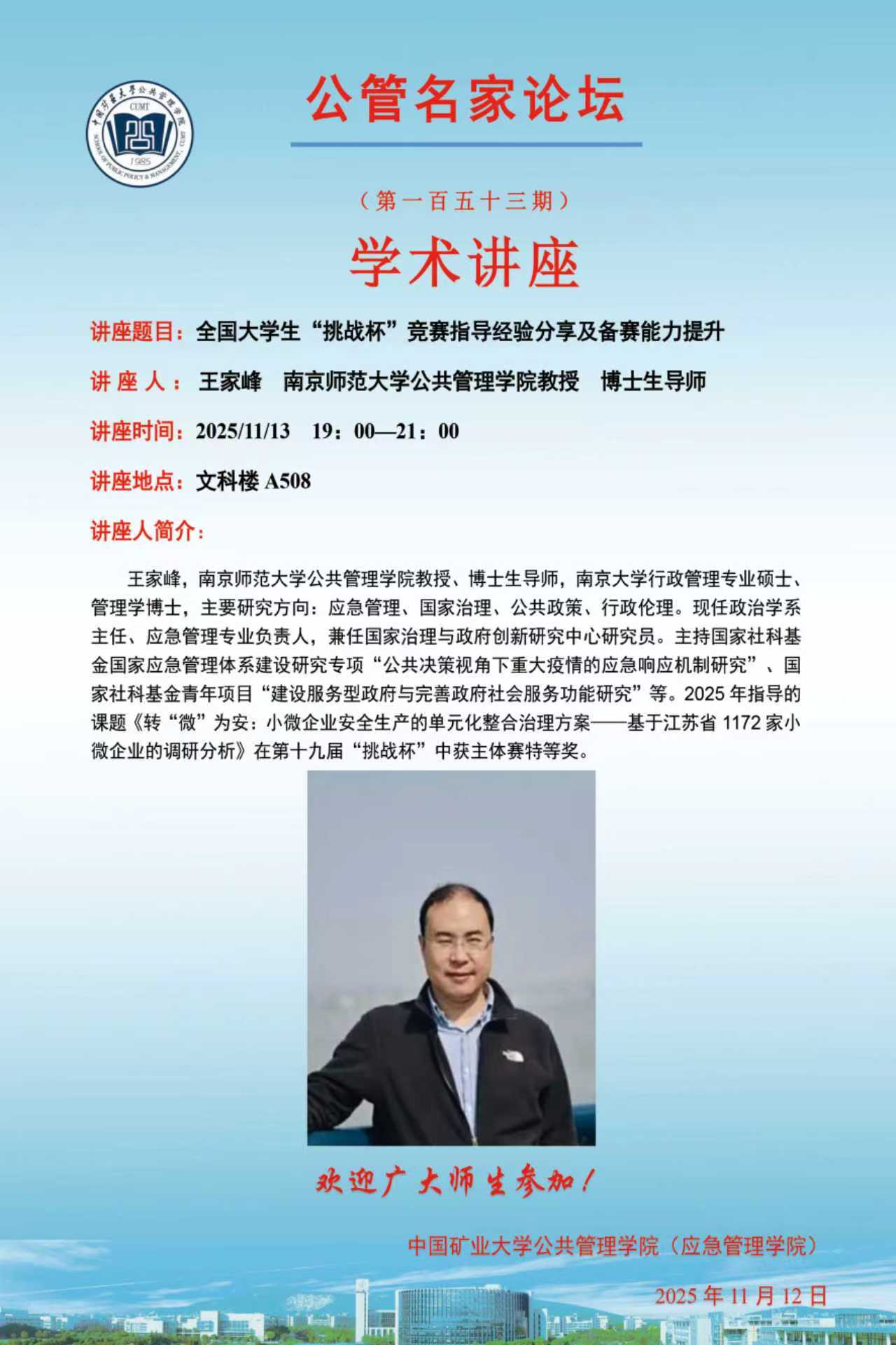 公管名家论坛(第一百五十三期):全国大学生“挑战杯”竞赛指导经验分享及备赛能力提升