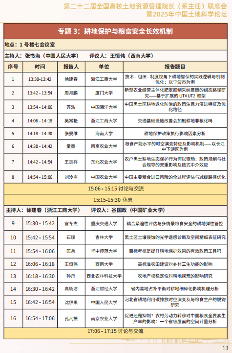会议主要学术观点及评析: 会议主题为“智慧赋能与国土空间治理”,由教育部公共管理教学指导委员会、全国高校土地资源管理院长(系主任)联席会、《中国土地科学》编辑部和中国人民大学主办,由中国人民大学公共管理学院、《公共管理与政策评论》编辑部承办,由教育部哲学社会科学实验室—中国人民大学数字政府和国家治理实验室、中国人民大学国土规划与国家治理研究院、中国人民大学林增杰土地科学发展基金协办。 分论坛共进行了128场报告,主题涉及碳中和目标下的国土空间优化与低碳转型、耕地资源管理与农业绿色发展、耕地保护与粮食安全长效机制、自然资源优化配置与高效利用、生态安全格局构建与国土空间韧性提升、城市更新与国土空间治理现代化、全域土地综合整治与城乡融合发展新路径、乡村振兴背景下农村土地制度改革深化。本人担任专题3评议人并在专题5进行《耕地资源安全风险诊断的理论框架与方法体系》的汇报。