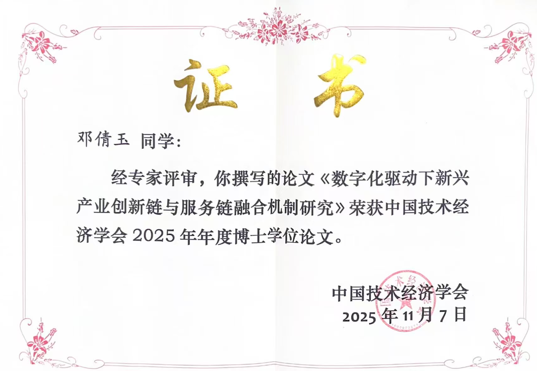 会议主要学术观点及评析: 以“人工智能驱动新质生产力跃迁和治理变革”为主题的中国技术经济学会第三十二届学术年会在浙江杭州举行。年会由中国技术经济学会联合浙江工业大学主办,浙江工业大学管理学院、浙江工业大学中国中小企业研究院等联合承办。年会共包括20个平行论坛、15个征文交流论坛和3个工作委员会论坛等38个专题论坛依次举办,围绕AI赋能产业转型、数据治理、绿色创新、脑机融合等热点议题,展开了深入讨论,充分展现了中国技术经济学会理事、会员跨学科、跨领域的融合创新活力。 在学术年会主论坛上,举办了表彰、嘉勉、发布、揭牌等系列活动,表彰了2024年优秀/良好分支机构和全国质量创新案例大赛获奖者,嘉勉了优秀学术论文作者、年度博士学位论文作者及指导老师等。本人的博士学术论文《数字化驱动下新兴产业创新链与服务链融合机制研究》荣获中国技术经济学会2025年年度博士学位论文。