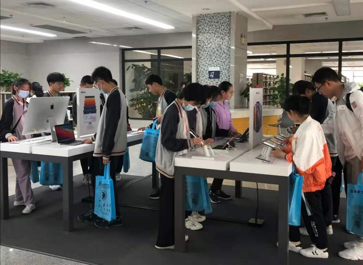 早上八点半,宿豫中学师生一行到达图书馆。宫煜介绍了入馆参观的注意事项,并带领同学们开启图书馆之旅。图书馆管理员林琳、贺琳琳老师为师生一行进行讲解说明。本次图书馆参观分为四个环节:于图书馆一楼大厅,贺琳琳老师详细介绍了自助借阅机、密集书库、馆藏经典、自助检索机和社会科学阅览室Ⅱ,并鼓励同学们亲自操作自助借阅机和自助检索机;于图书馆二楼,林琳和贺琳琳老师介绍了社会科学阅览室Ⅰ的藏书数量、藏书类型等情况,并带领同学们自由阅览书籍;于图书馆三楼,林琳老师介绍自然科学阅览室和多媒体阅览室的概况;于图书馆五楼“知学空间”,同学们亲自体验智能机器人、苹果电脑等智能设备。