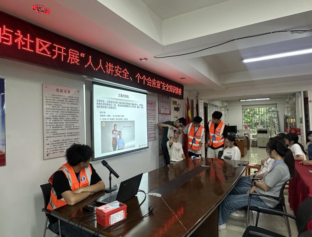 7月10日上午,调研小队前往福州市王庄街道鼎屿社区开展调研。首先,团队宣讲员围绕日常应急知识展开科普,涵盖消防安全、用电安全、电信诈骗防范等,并针对典型突发场景的应对策略、常见应急逃生要点进行着重强调。理论讲解后,队员现场示范海姆立克急救法、止血包扎和心肺复苏的正确操作,社区工作者和物业人员依次上台学习实操。同日下午,团队深入社区居民小区、周边商业街,开展应急知识问卷调研,并围绕应急措施落实、物资储备情况进行访谈。