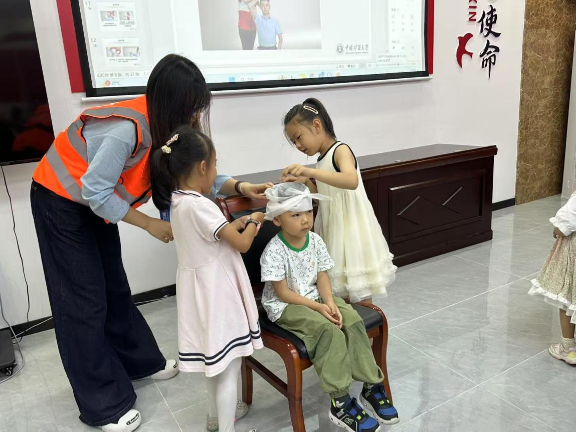 下午,团队在社区活动中心面向小朋友开展了应急知识宣讲活动,内容聚焦防溺水、防触电、防拐骗三大主题。团队成员向小朋友们演示简单的包扎方法,包括三角巾的折叠及伤口的覆盖、固定等步骤,部分孩子现场体验,在互动中掌握了实用技能。