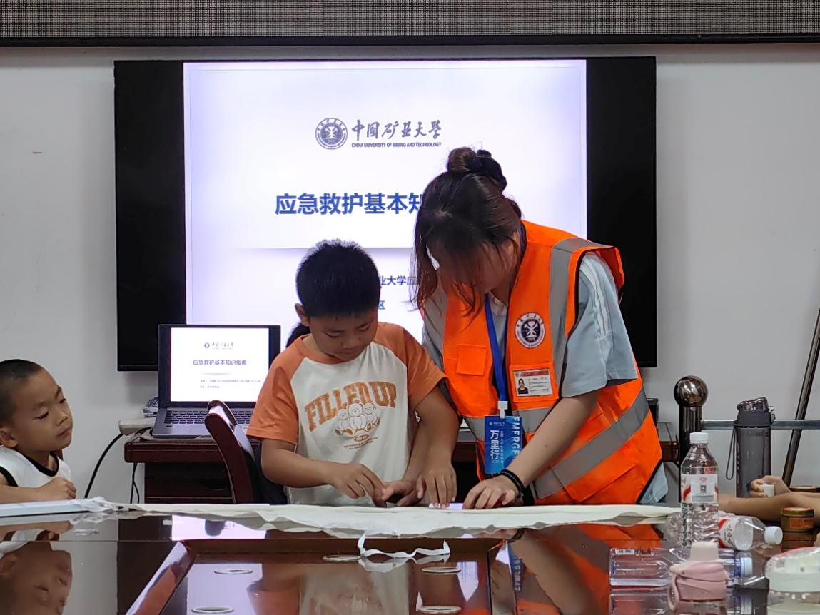 针对社区儿童,实践团队打造了特色应急科普活动。成员们以生动有趣的案例讲解、直观的视频演示为载体,传授火灾逃生、防溺水自救等关键应急知识,还通过模拟头部包扎、止血固定等急救场景,指导孩子们实操练习。社区儿童热情高涨,在轻松愉快的氛围中掌握了实用的急救技能。