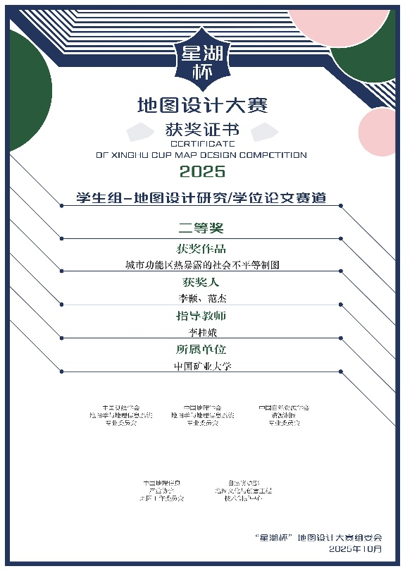 由李桂娥、闫庆武老师联合指导,我院土地资源管理专业学生唐天雨、冯向阳、田佳琦、高振嘉共同完成的作品《National Multi-Hazard Hotspots (2009-2023) Map of China News-Driven Insights to Spatiotemporal Mapping of Vulnerability Exposure》荣获学生组地图设计研究/学位论文赛道一等奖。同时,由李桂娥老师指导,土地资源管理专业研究生李颢、范杰共同完成的作品《城市功能区热暴露的社会不平等制图》,荣获学生组地图设计研究/学位论文赛道二等奖。
