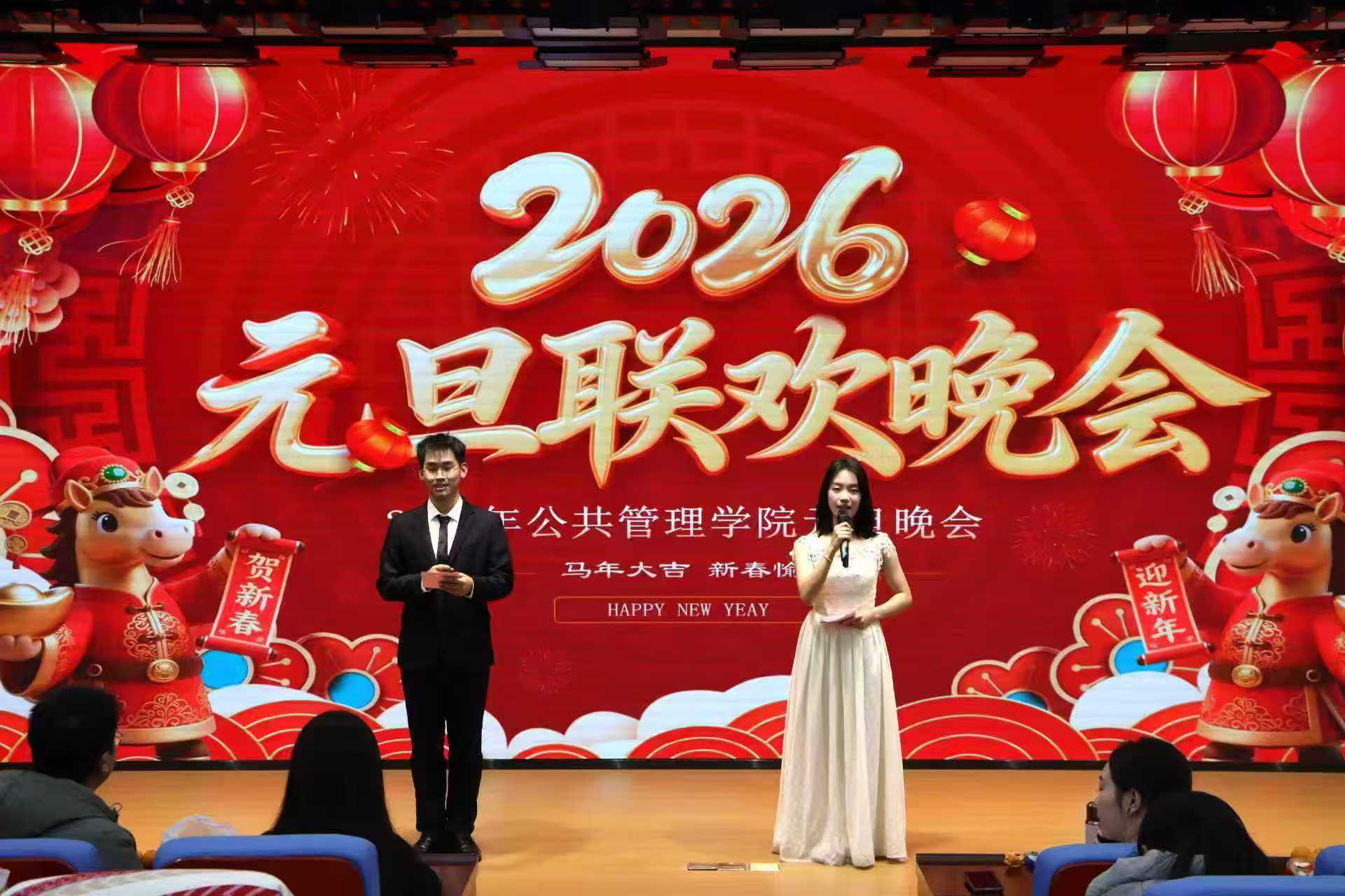 12月26日晚,公共管理学院于公管大讲堂举办2026年团学组织元旦联欢晚会。院学工办主任李月、院团委书记陈妍、25级辅导员刘卓及学院兼职辅导员出席此次晚会,各团学组织成员参加。