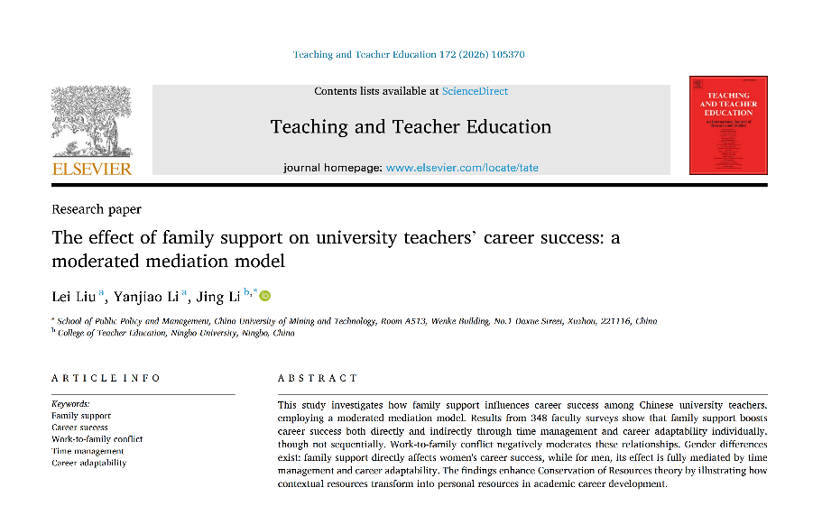 近日,我院刘蕾教授在教育学领域顶级期刊《Teaching and Teacher Education》发表题为“The effect of family support on university teachers’ career success: a moderated mediation model”的学术论文。该期刊为中科院一区、SSCI一区期刊,在教育学领域、特别是教师发展领域具有重要学术影响力。