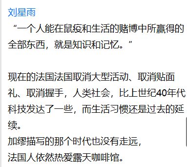 班会伊始,刘雨萌简要地介绍了塞万提斯、莎士比亚和汤显祖三位文学家,并以他们共同的辞世日引出了4月23日“世界读书日”的起源,并激励同学们向伟人们学习;随后,同学们积极参与讨论,分享疫情宅家期间阅读的书目,《江城》、《鼠疫》、《墨菲定律》等书列入同学们的喜爱好书榜单;紧接着,班长通过两则关于阅读书目的视频为同学们推荐了一些好书,并对《鼠疫》、《大流感》、《切尔诺贝利的悲鸣》等关于疫情与灾难的著名书目做了简单的解读;最后环节是“组句成诗”,班级每位同学都思考了一句关于疫情的七言句子,讨论区充斥着浓浓的真情实感,同学们写的句子后续还会由班级里擅长朗诵的同学制作成原创音频,班会在热烈的讨论气氛中顺利结束。