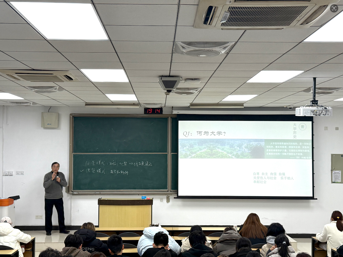 课堂上,张长立教授围绕“认识大学”“大学之大”“大学之学” 三个方面展开讲授。他溯源中外大学发展脉络,从柏拉图学园、中世纪大学到中国古代书院,再到现代研究型大学,结合蔡元培“兼容并包”、竺可桢“两问”等经典理念,阐释“大学之道,在明德,在亲民,在止于至善”的深刻内涵,让学生理解大学“追求真理、勇于创新”的精神内核。