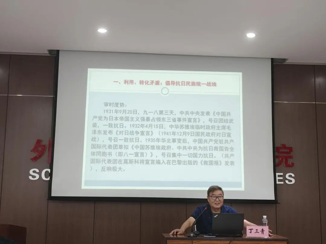 6月29日上午,“中国共产党的智慧与抗日民族统一战线”专题报告会在外文学院楼B508顺利举行。本次活动由外文学院、公管学院和人文学院关工委联合承办。马克思主义学院丁三青教授为师生作《中国共产党的智慧与抗日民族统一战线》专题报告。校关工委秘书长潘盘甫,学院专兼职辅导员和学生党员、积极分子共100余人参加活动。外文学院党委副书记、关工委副主任朱正中主持报告会。