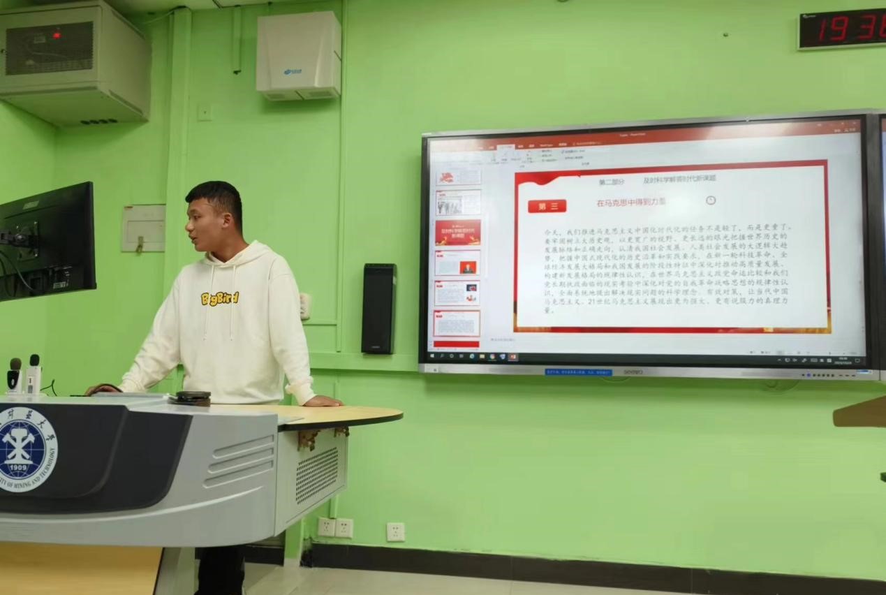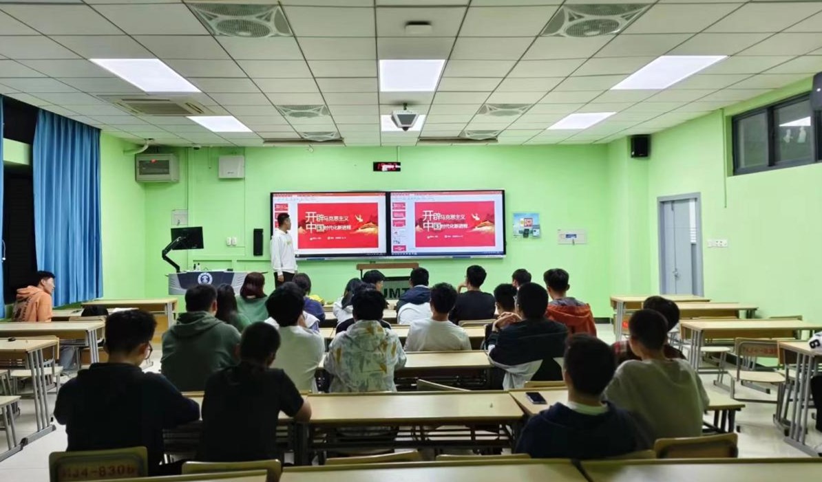 在活动第一部分,团支书司浩着重讲述了马克思主义的伟大意义,带领同学们深入了解马克思主义的内涵。接着,司浩同学与在场同学进行互动,探讨了“在马克思主义中如何得到力量”以及“在百年未有之大变局中如何探求马克思主义”等问题。最后,同学们共同观看党团知识教育宣传片。