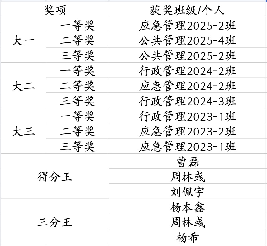 篮球赛不仅是速度与力量的竞技舞台,更是公管学子团队精神及拼搏意志的集中展现。赛场上,各班级战队全力比拼,球员传接、防守表现亮眼,现场观众、啦啦队助威声热烈,比赛氛围紧张激烈。历经11天的多轮角逐,比赛陆续产生各年级的获奖队伍、得分王、三分王。颁奖仪式上,获奖队伍和选手们依次上台领奖,全体工作人员与参赛队员合影留念。