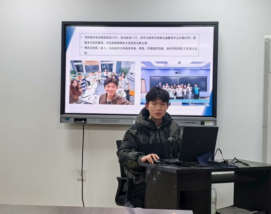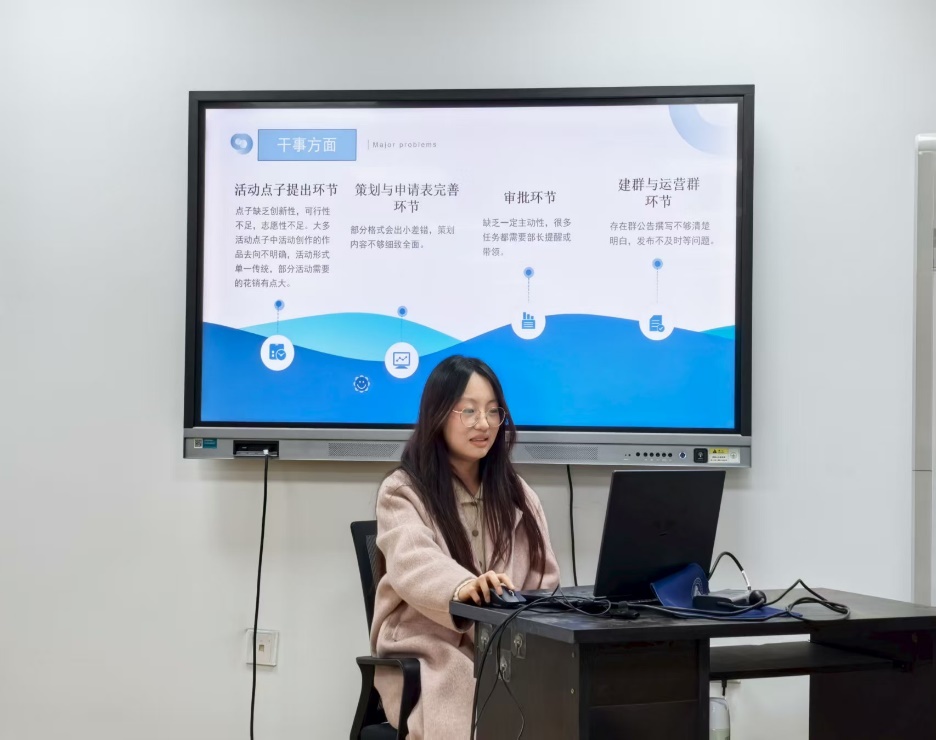 会议伊始,各部门部长依次上台述职,对上学期志愿服务、活动组织、内部建设等方面的工作成果进行复盘,直面工作中的短板与不足,剖析问题根源,并结合部门实际提出具体可行的改进计划。随后,王梦佳与主席团成员进行提问和补充,进一步明确部门工作中的不足,为后续工作开展指明清晰方向。最后,王梦佳作总结点评,充分肯定了全体成员上学期的付出与成效,同时围绕团队协作、活动质量提升、志愿品牌打造等方面提出更高要求,鼓励大家凝心聚力、查漏补缺,推动公管青协志愿服务工作再上新台阶。